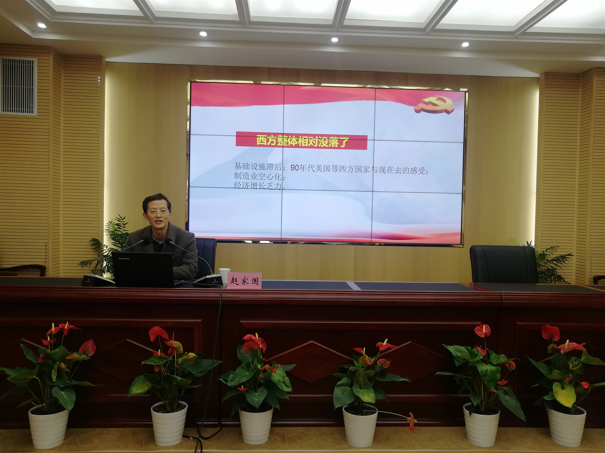 接著,趙家國教授以“12345”為提綱挈領(lǐng),結(jié)合國內(nèi)國外形勢,為大家詳細解讀了黨的十九屆五中全會精神的精髓和要義。“1”是一個重大判斷揭示未來發(fā)展環(huán)境異常復(fù)雜:《建議》提出當(dāng)前和今后一個時期,我國發(fā)展仍然處于重要戰(zhàn)略機遇期,但機遇和挑戰(zhàn)都有新的發(fā)展變化?!?”是兩個全局了然于胸謀劃未來:《 建議》指出全黨要統(tǒng)籌中華民族偉大復(fù)興戰(zhàn)略全局和世界百年未有之大變局,深刻認(rèn)識我國社會主要矛盾變化帶來的新特征新要求....。我們從這兩個大局出發(fā)來制定規(guī)劃?!?”是三個“新”揭示新征程無比豪邁:新階段、新發(fā)展理念、新發(fā)展格局?!?”是四個首次展現(xiàn)復(fù)興圖強雄心壯志:堅持創(chuàng)新在我國現(xiàn)代化建設(shè)全局中的核心地位,首次把全體人民共同富裕取得更為明顯的實質(zhì)進展作為遠景目標(biāo)提出,首次明確了建成文化強國的具體時間表,明確提出到2035年建成文化大國,首次提出確保二〇二七年實現(xiàn)建軍百年奮斗目標(biāo)?!?”是五大原則體現(xiàn)黨的領(lǐng)導(dǎo)更加成熟高超:堅持黨的全面領(lǐng)導(dǎo),堅持以人民為中心,堅持新發(fā)展理念,堅持深化改革開放,堅持系統(tǒng)觀念。